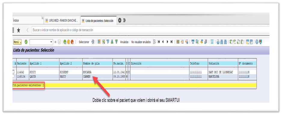 Si hi ha més d’una coincidència amb les dades introduïdes apareixeran tots els pacients i fent doble clic sobre el pacient accedirem al seu SMARTUI: